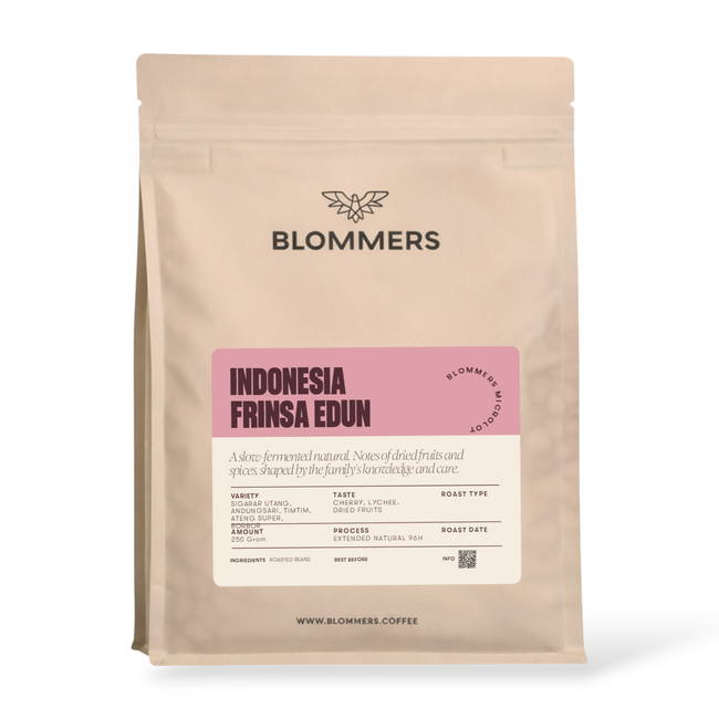 This coffee comes from Frinsa Estate in West Java, Indonesia. The farm is run by Wildan Mustofa and his wife, Atieq, who started their work in this region in 2010. Their estate sits around 1400 meters and gives them full control from harvest to drying, sorting, and storage. Frinsa works with their own plots and with trusted outgrowers, bringing together cherries from across the Sunda highlands.